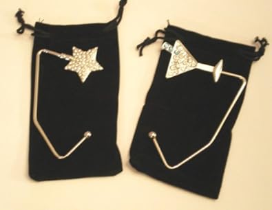 This crystal star purse hook is a silver star embedded with clear crystals. The crystal martini purse hook is a silver martini glass embedded with clear crystals and blue crystals for a straw. Both of the hooks are perfect for night or day. The wide clearance allows them to hang on wider tables and the no-slip base pad keeps your handbag secure. These hooks will hold about 15lbs. and lay flat when not in use. A velour carrying pouch is included with each hook for safe keeping in your handbag.