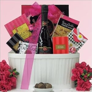 Deluxe Valentine Day Wine & Chocolate Gift BasketsSend this vibrant & beautifully designed wine & sweets gift basket for Valentine???s Day that features the delicious, award-winning Rosa Regale Dessert Wine from Banfi Vineyards - a unique sparkling red wine with a hint of rose petals and raspberry aromas. In addition to this wonderful wine, she'll enjoy a wide assortment of gourmet cookies, chocolates and candy that she is sure to love. And, she'll adore the trendy and unique style of the basket that features a Houndstooth design purse gift box with decorative pearl handle filled with white chocolate pretzels, as well as the "Time Out" Strawberry Kiwi Dark Chocolate truffles and so much more!! Includes:Rosa Regale Banfi Sparkling WineToo Good Gourmet Houndstooth Purse Gift Box with White Chocolate PretzelsMadelaine's Pink Foiled 9" Milk Chocolate Sweetheart RoseLindt Raspberry Chocolate TruffleTime Out Strawberry Kiwi Dark Chocolate Trufflesde Geneve Dark Chocolate Coconut
