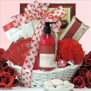 Luxury Spa Delight - Valentine's Day Spa Gift BasketSend her this gorgeous spa gift basket for Valentine's Day filled with a nice assortment of Simply Be Well organic bath & body gift items, spa, tea, cookies, candles and more. Includes Moisturizing Gloves for Hand Rejuvenation and Bath Net Exfoliating Puff. Features all natural Simply Be Well Organic Pomegranate Cleansing Body Bar and Hand & Body Lotion. Gift Includes:Simply Be Well Organic Pomegranate Fragrance Cleansing Body BarSimply Be Well Organic Pomegranate Fragrance Hand & Body LotionBath Net Exfoliating Puff ~ RedMoisturizing Gloves for Hand Rejuvenation, Hydration & RepairWhite Cathedral Votive Candle ~ 2" x 2"Epicure Euroopean Bakery Italian Double Chocolate Raspberry CakeLindt Raspberry Chocolate TruffleJanine & Melanie Raspberry Tea CookiesStash's Pomegranate Raspberry Green Tea ~ 10 count...in an Oval White Painted Gift Basket hand-tied with Valentine's Day Hearts ribbon.