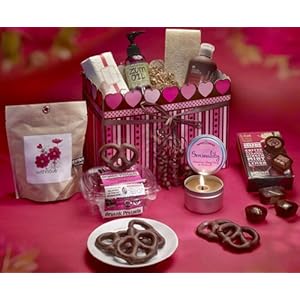 A unique and romantic gift collection that combines the finest natural soap, lotion, loofah, massage oil, organic chocolate, organic chocolate pretzels, and an evocative beeswax candle with pure essential oils to help create the setting for love and relaxation. The Garden in a Bag kit grows beautiful red cosmos flowers for a lasting impact. Bluecorn Naturals beeswax candle tin with pure essential oils - Sensuality scented Seth Ellis 9 piece organic Fairtrade chocolate truffles Pangea lotion - French Chamomile (8.5 oz) Garden in a Bag - "With Love" (grows red cosmos) Napa Soap Company all natural soap - Berry Rose scented Zum Massage oil - Lavender Lemon (4 oz) Earth Therapeutics Loofah - 5" Liz Lovely organic fairtrade chocolate pretzels (5.2 oz)