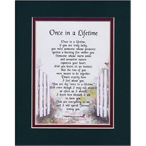 This beautiful, heart-stirring verse is sure to touch your true love's heart in a profound and meaningful way. This quality product is 8x10 in size. It is Double-Matted. The verse is ............ .......... Once In A Lifetime...... . Once in a lifetime.........If you are lucky,......you meet someone whose presence......ignites a burning fire within you......someone whose warm smile......and sensitive nature......captures your heart,......and you know..in an instant......that the two of you ......were meant to be together......Thats exactly how......I feel about you......You are my once in a lifetime......and even though i may not show it......as often as i should......I know how blessed I am......to have you......You are everything to me,......And I will spend forever......loving you......