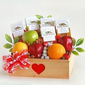 Valentine Fruitful Surprise Valentines Day Fruit GiftSurprise your valentine this Valentine's Day fruit gift and put a smile on their face when you send this adorable wood crate with a red embossed heart filled with fresh fruit and nuts. The crate includes an assortment of fruit as well as 5 types of delicious California nuts from Nunes Farms.